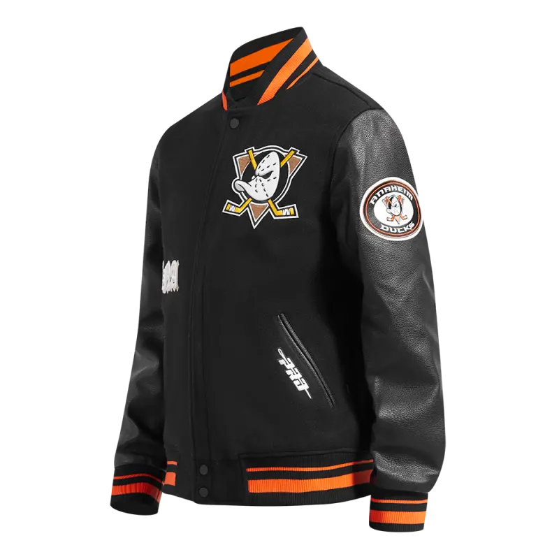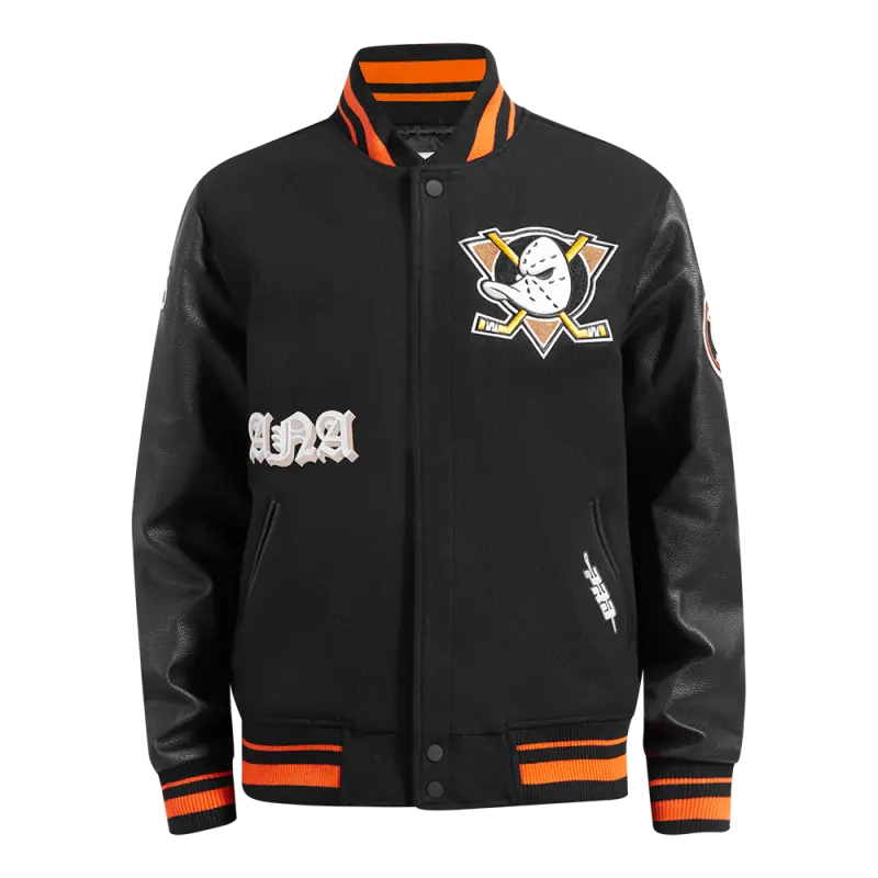 NHL ANAHEIM DUCKS OLD ENGLISH MEN’S RIB WOOL VARSITY JACKET (BLACK\/ORANGE)