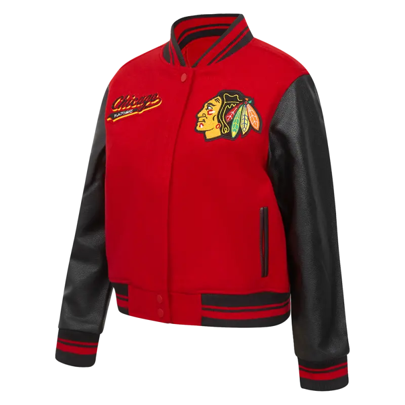 NHL CHICAGO BLACKHAWKS SCRIPT TAIL WOMEN’S WOOL VARSITY JACKET (RED\/BLACK)