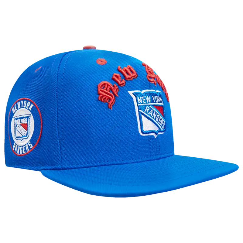 NHL NEW YORK RANGERS OLD ENGLISH UNISEX 6 PANEL SNAPBACK HAT (ROYAL BLUE)