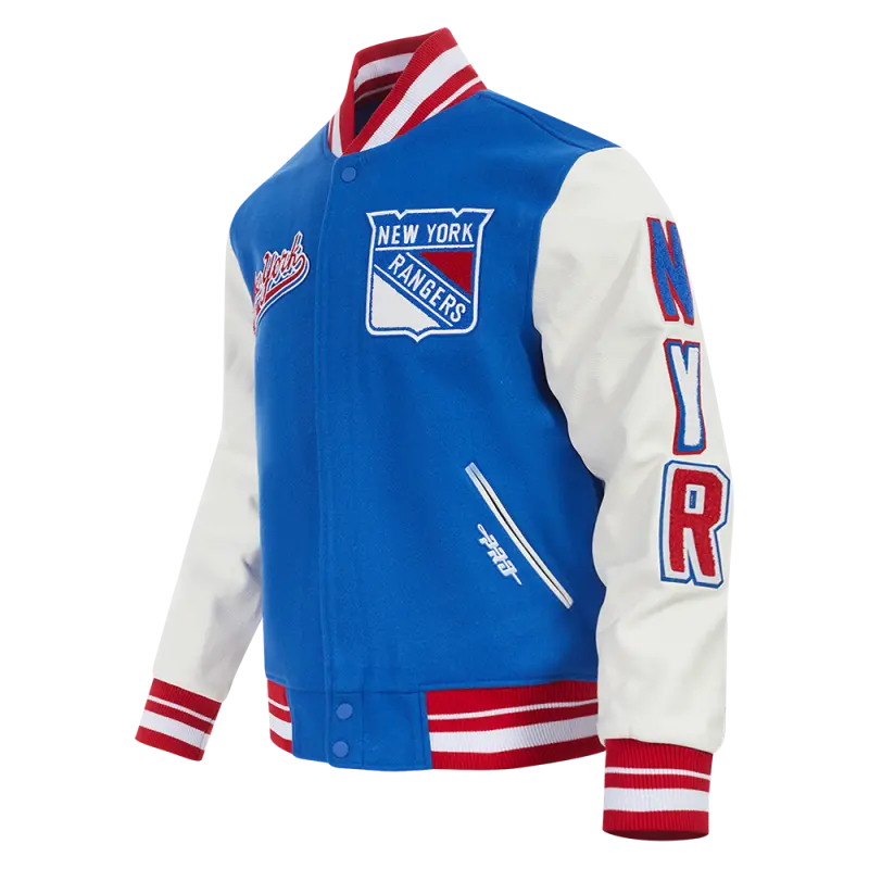 NHL NEW YORK RANGERS RETRO CLASSIC WOMEN’S RIB WOOL VARSITY JACKET (EGGSHELL\/ROYAL BLUE)