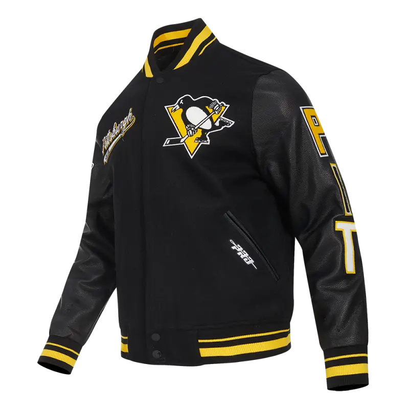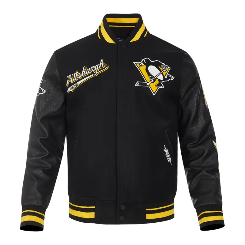 NHL PITTSBURGH PENGUINS SCRIPT TAIL WOMEN’S WOOL VARSITY JACKET (BLACK\/YELLOW)