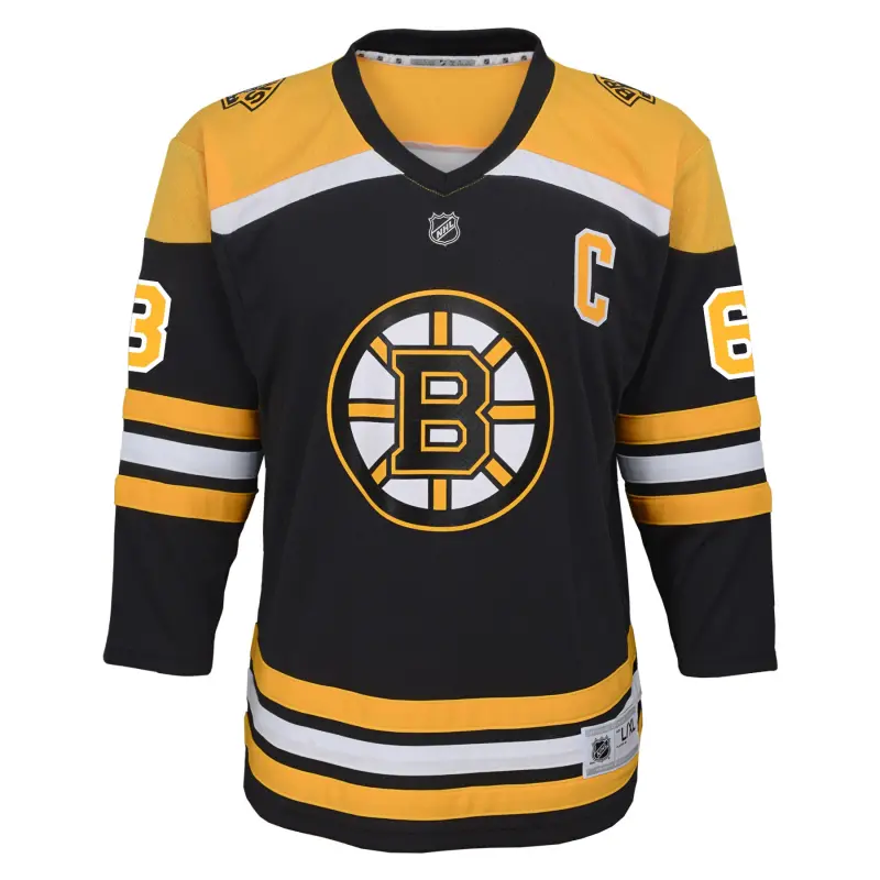 Please Note: This product ships directly from the USA. Your young fan is always tuned in to the action when the Boston Bruins take the ice. Be sure your kiddo is outfitted properly by grabbing them this Brad Marchand Home Replica Player jersey. The classic Boston Bruins design and crisp team graphics will keep your youngster looking their best as they cheer the squad to victory.